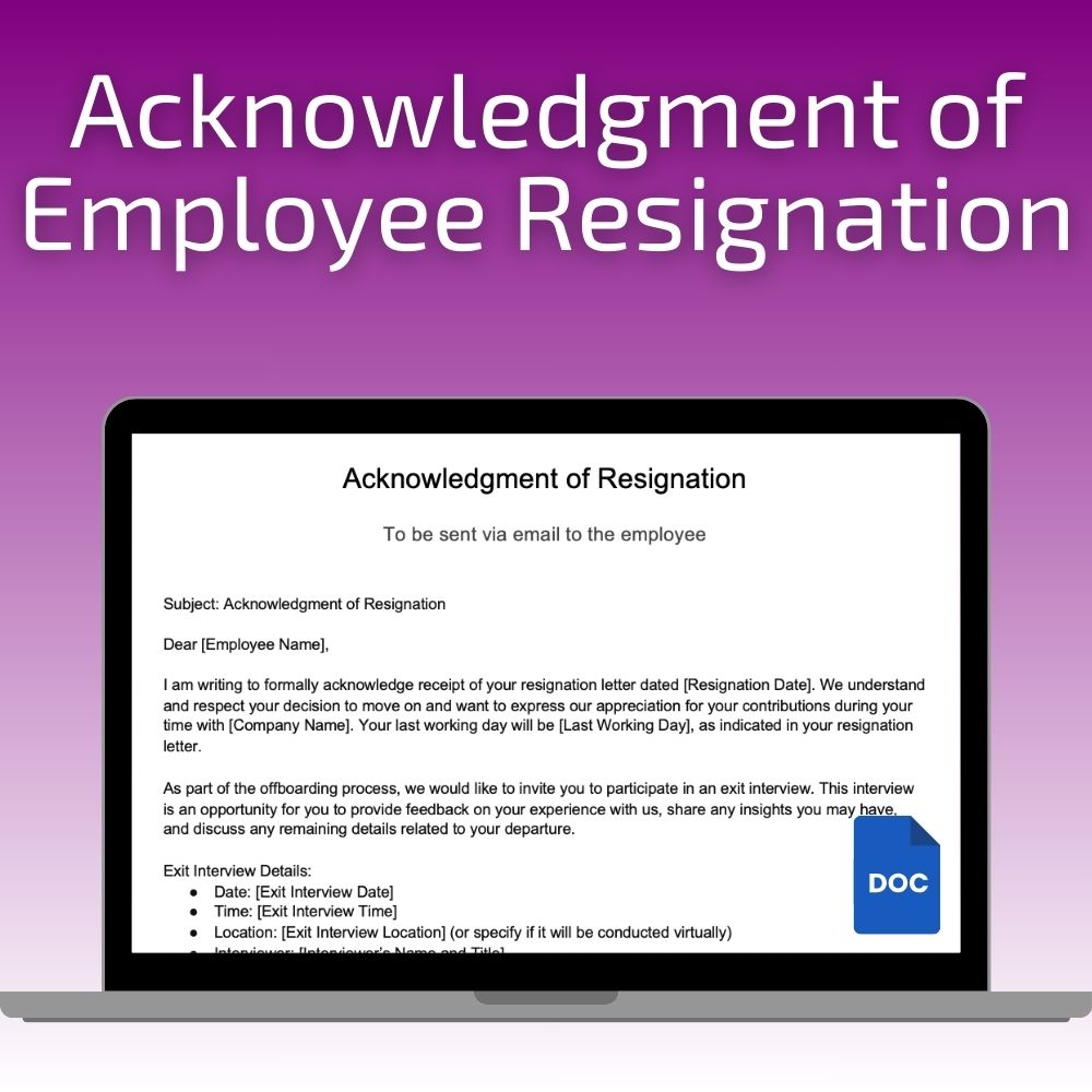 Keywords: Employee Resignation Acknowledgment, Resignation Email Template, HR Communication Tools, Exit Process Template, Resignation Acceptance Email, Customizable HR Templates, Professional Resignation Response, HR Best Practices