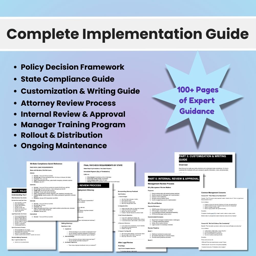 Q: Is legal review included? A: We recommend having an employment attorney review your final handbook (guidance included). Legal review is not included in this package. This handbook is not legal advice.