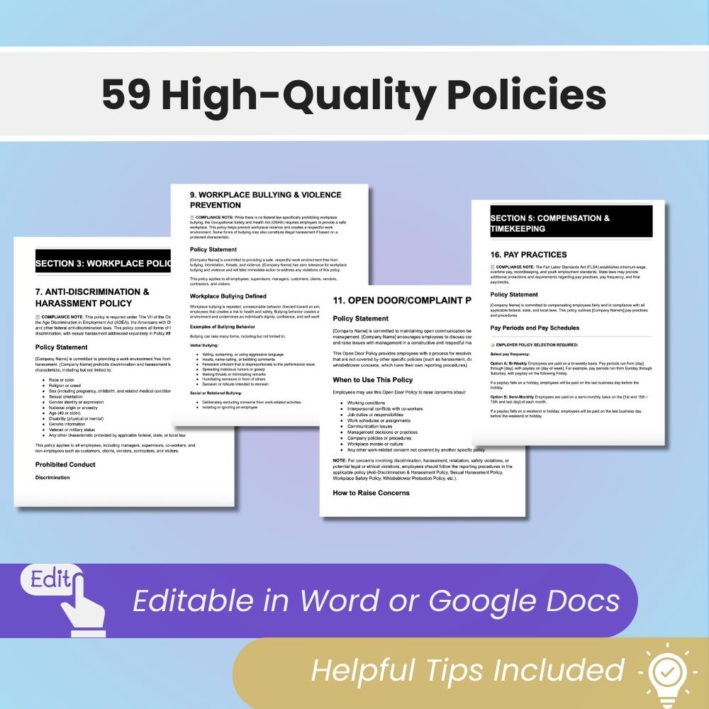 ✅ Complete 59-Policy Handbook Template Professional, high-quality handbook covering all essential employment topics: