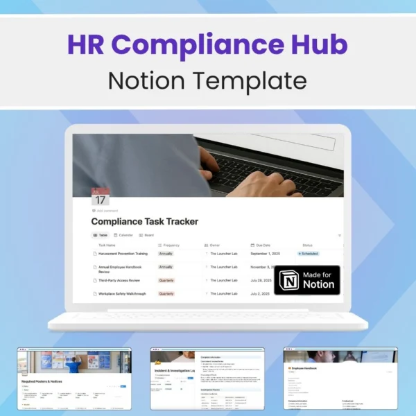 Each module includes Table, Kanban, and Calendar views, allowing you to toggle between strategic overviews and detailed execution in seconds. Whether you’re preparing for an audit or onboarding a new hire, this Notion template helps you stay compliant, reduce liability, and focus on strategic HR leadership.