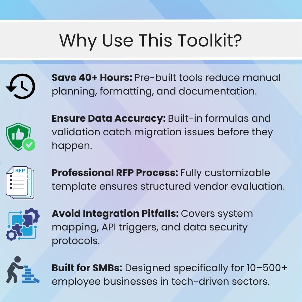 Whether you’re upgrading from spreadsheets or consolidating disconnected tools, this toolkit delivers a full implementation and RFP suite — saving you 40+ hours of setup time while ensuring data integrity, vendor accountability, and compliance from day one.