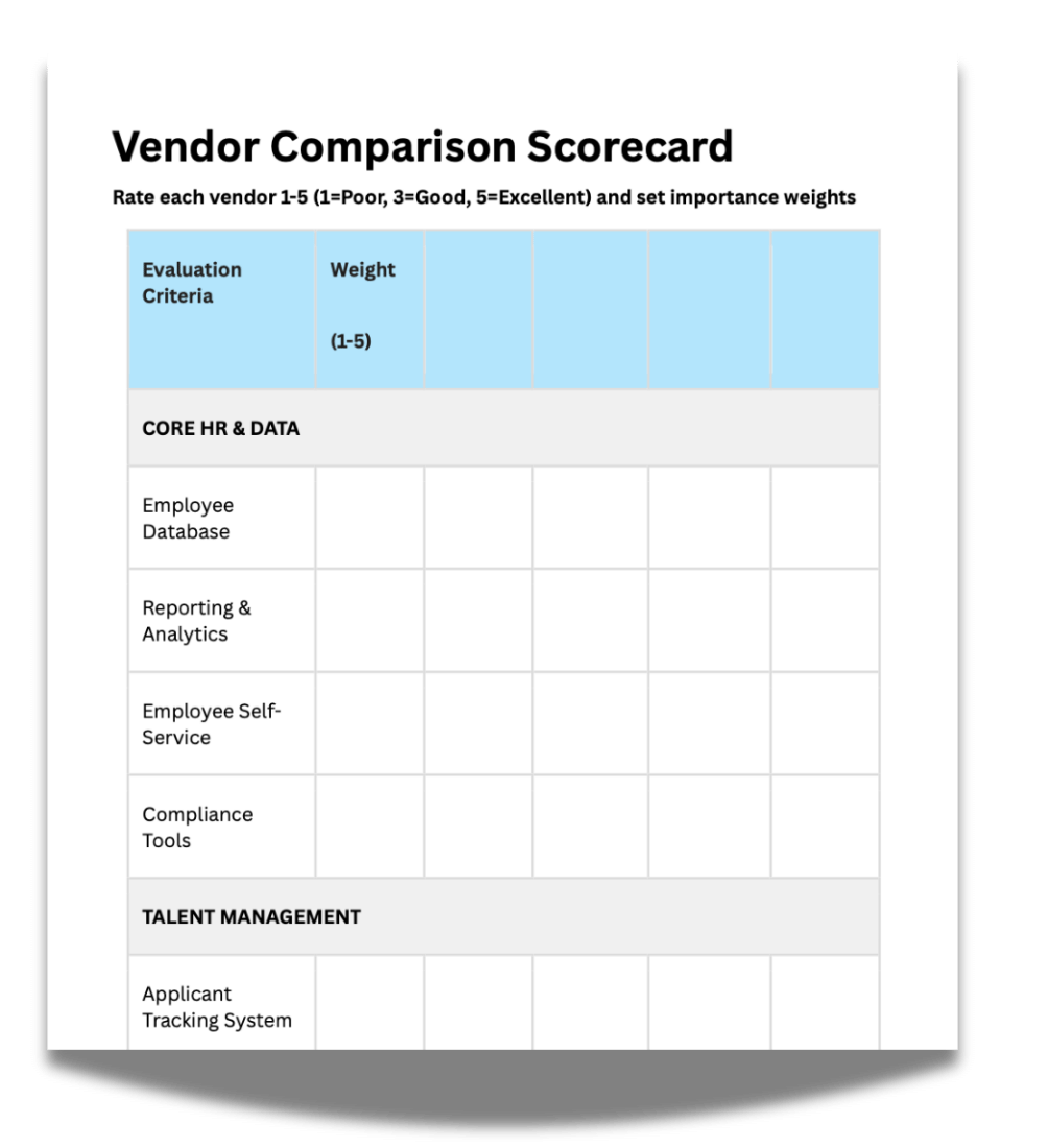 Preview of the HRIS Comparison Worksheet — customizable for any vendor shortlist.